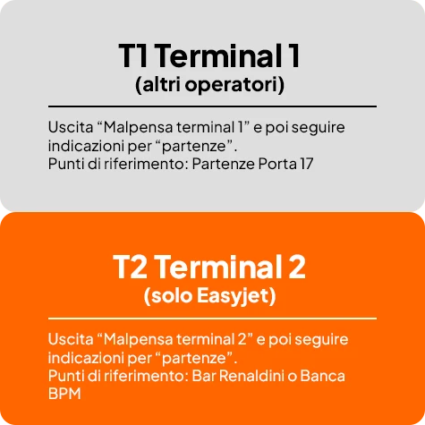 T1 Terminal 1 (altri operatori):Uscita "Malpensa Terminal 1" e poi seguire indicazioni per "partenze".