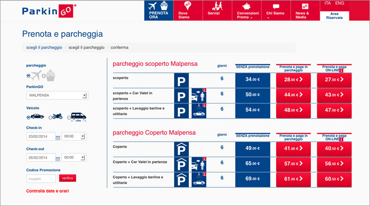 Maintenant, par conséquent, la réservation accorde non seulement au client une place de parking (couvert ou découvert), mais assure également le meilleur prix. Sur le site il y a trois gammes de prix, selon les méthodes de réservation et de paiement. D'ailleurs dans nos structures (Malpensa en particulier) ParkinGO est en train d'expérimenter les voies préférées pour les clients qui ont effectué le paiement en ligne, le tout pour rendre encore plus efficace le processus d'acceptation et le service fourni.