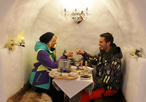 Mieux qu'un hôtel 5 étoiles! Une nuit dans un igloo est une expérience inoubliable pour un couple. Dîner aux chandelles, vin et un lit somptueux ... creusé dans la glace! Mais n'ayez crainte: l'intérieur de l'igloo est plus tiède que prévu, grâce à la capacité de la glace il y a une bonne conservation de la chaleur. Les sacs de couchage et couvertures seront bien vous protéger du froid la nuit.