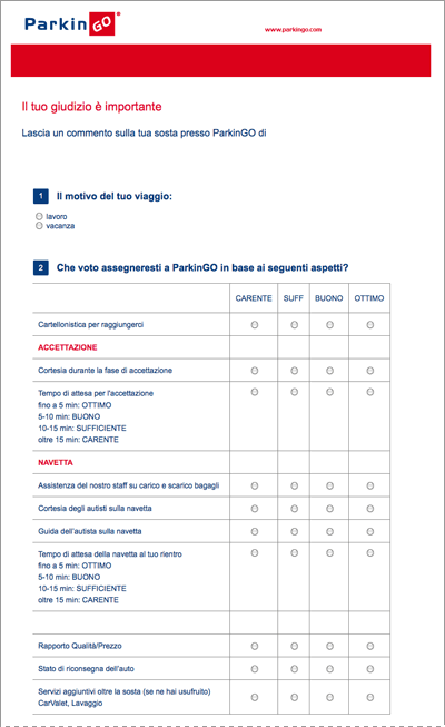 ParkinGO non è un network di parcheggi qualunque, ed è anche per questo che abbiamo ultimato un questionario per valutare i nostri servizi: dai tempi di attesa alla cortesia dei dipendenti, fino alla guida delle navette.