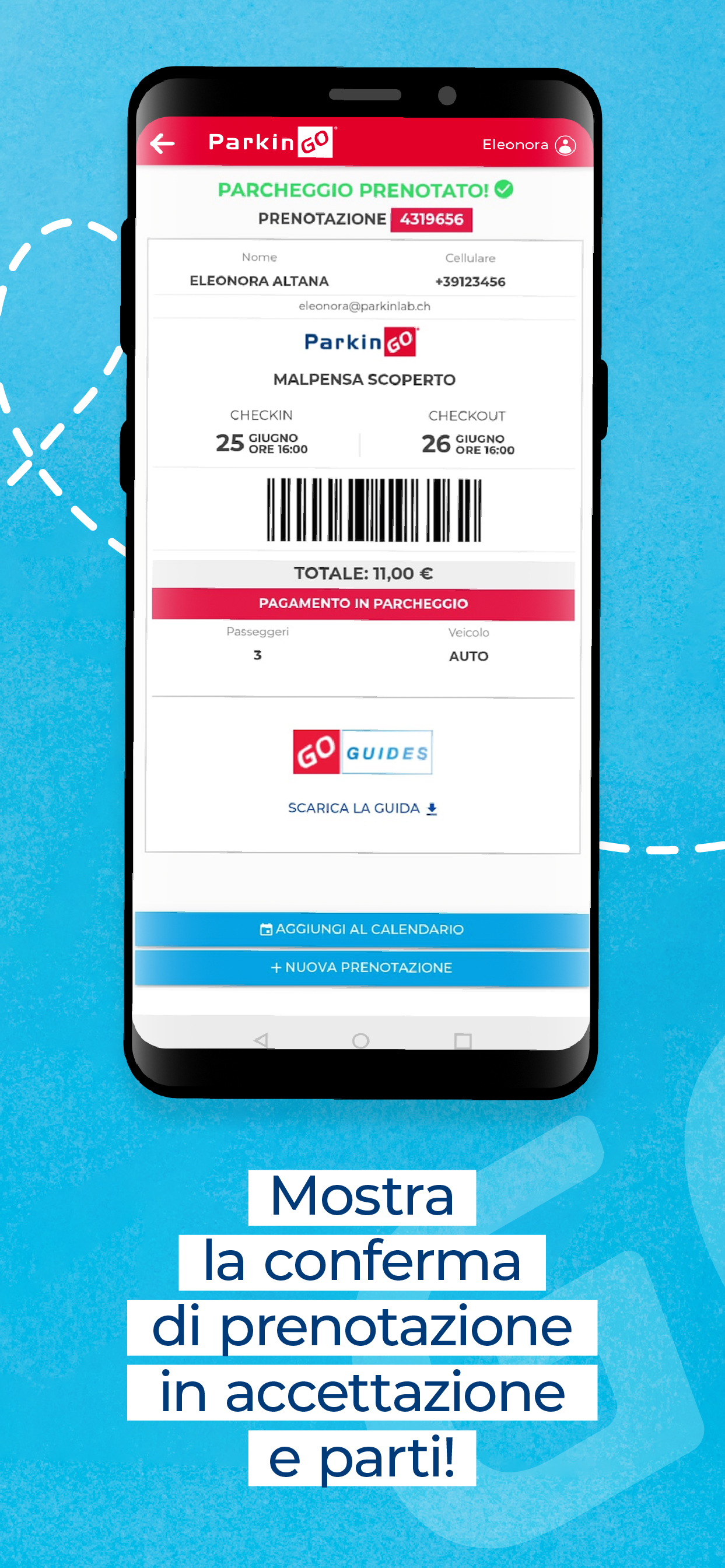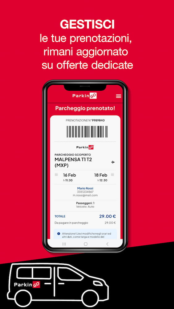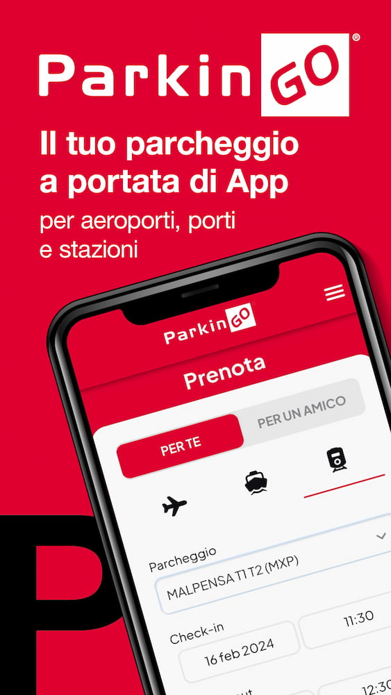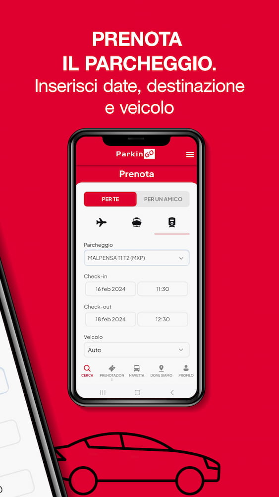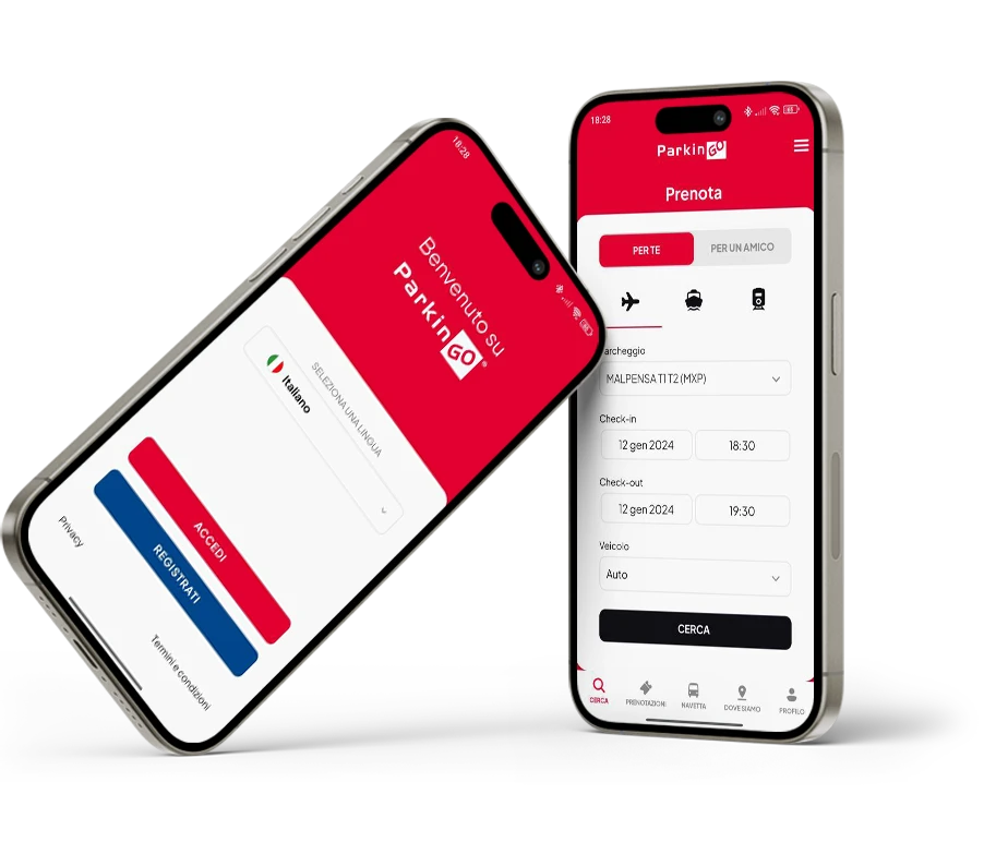 5 step per iniziare il tuo viaggio nel migliore dei modi. Apri l'app ParkinGO, inserisci i dati e prenota. Facile, no?