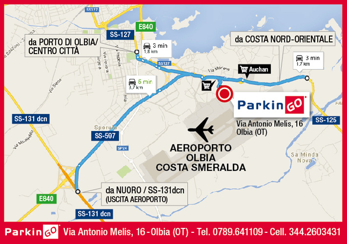 - percorrere via Antonio Melis e seguire le indicazioni per il parcheggio aeroporto Olbia ParkinGO.