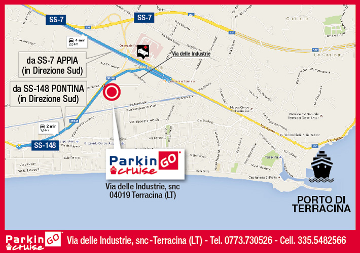 Il parcheggio portuale ParkinGO Cruise Terracina è un parcheggio in franchising del network ParkinGO Cruise. E' in grado di offrire un ottimo servizio a tariffe competitive offrendo ai propri clienti l'opportunita' di risparmiare fino al 70% rispetto alle tariffe praticate dai parcheggi interni al Porto, garantendo la massima affidabilità' e sicurezza. Il parcheggio garantisce un'elevata attenzione alle persone e alle auto in custodia. Prenotando riceverete una mail di conferma e le indicazioni per raggiungere il parcheggio ParkinGO Porto Terracina, sono inclusi il trasferimento con la navetta da e per il porto, l'assicurazione incendio e furto, la vigilanza e custodia del mezzo 24h.