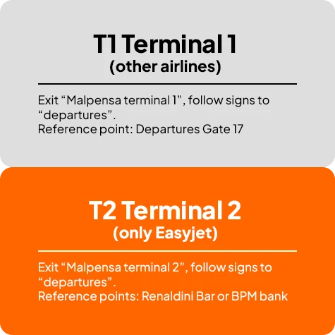 - Chegada ao Terminal: Dirija-se diretamente ao terminal T1 ou T2 de Malpensa, conforme necessário. Recomendamos que entre em contato conosco 15 minutos antes de chegar, usando o número fornecido na confirmação.