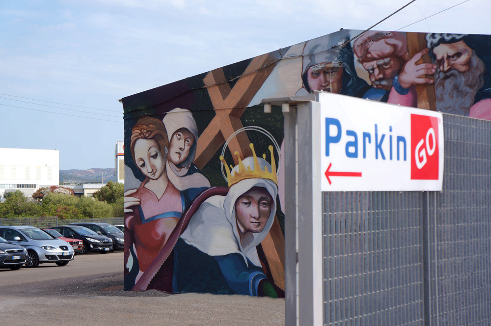 "Para ParkinGO Olbia queria reproduzir um trabalho que tivesse uma forte ligação com o território. Paolo Cova, amigo e historiador de arte, sugeriu esse trabalho para mim, que faz parte de um políptico de madeira na igreja de Santa Elena Emperatriz, em Benetutti, uma cidade perto de Sassari. A pintura permaneceu nesta igreja por séculos e os habitantes da Benetutti a consideram um objeto de devoção por gerações. Eu não consegui encontrar um trabalho melhor para o meu projeto ".